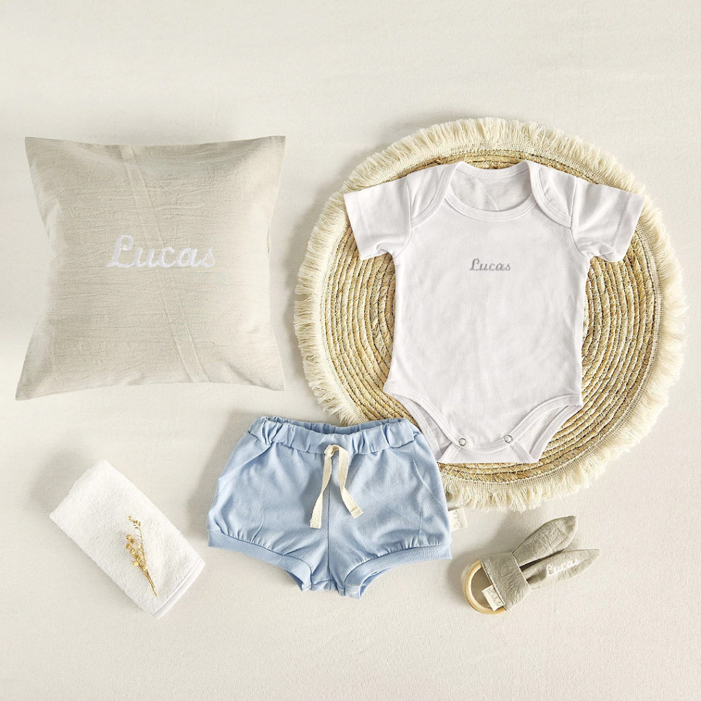 Body Americano PERSONALIZADO. Manga corta en jersey blanco o con estampa exclusiva de EstiloBebe, 100% algodón premium. Cuello Americano y abertura pañalera con dos broches snap metálicos. Puños, cuello y entrepiernas ribeteados con terminación picót en cuello