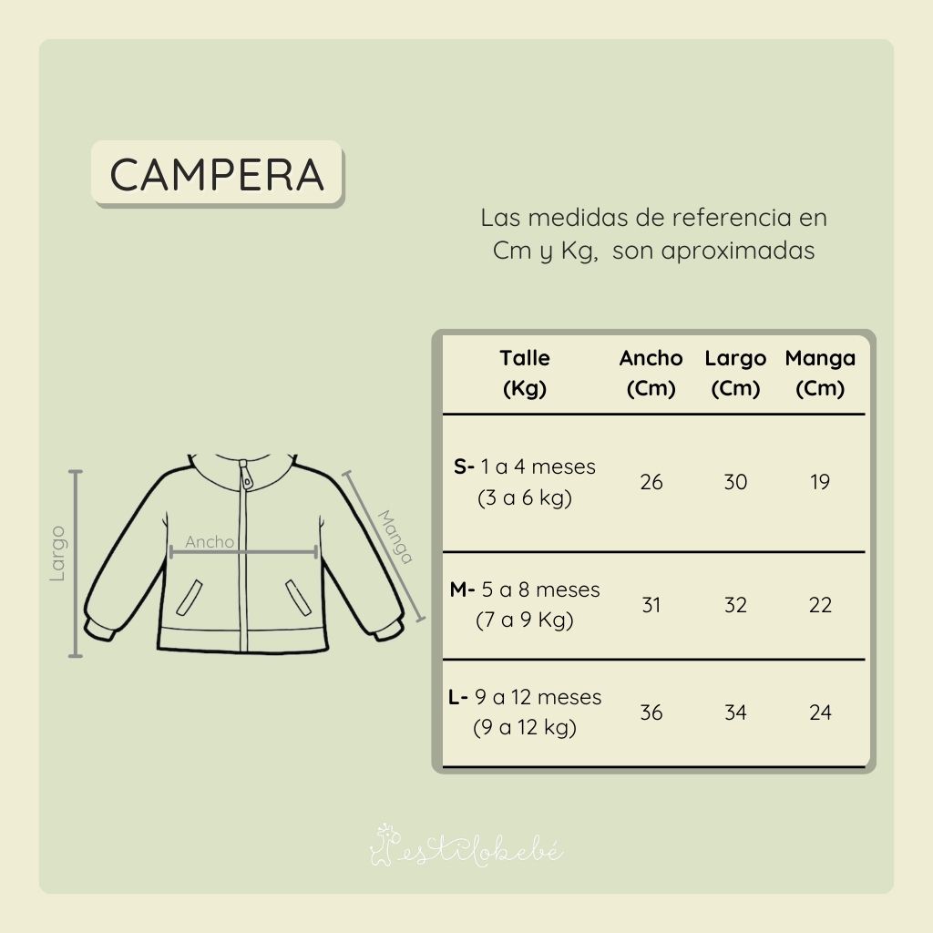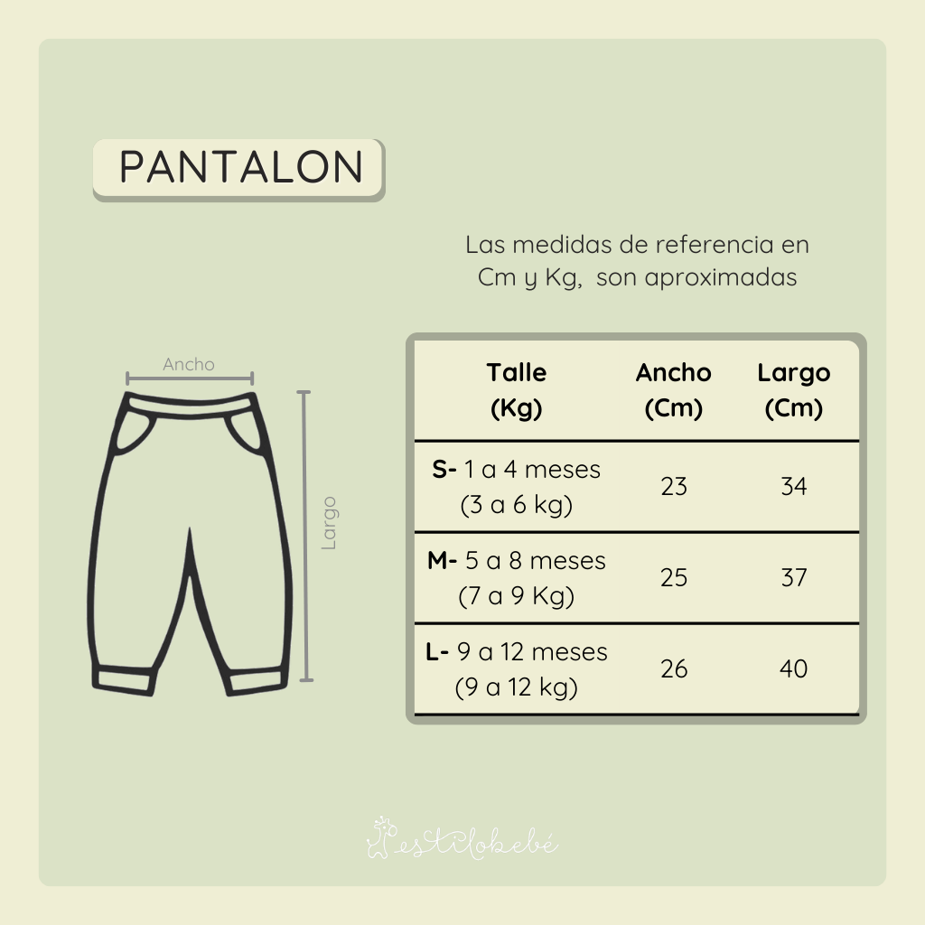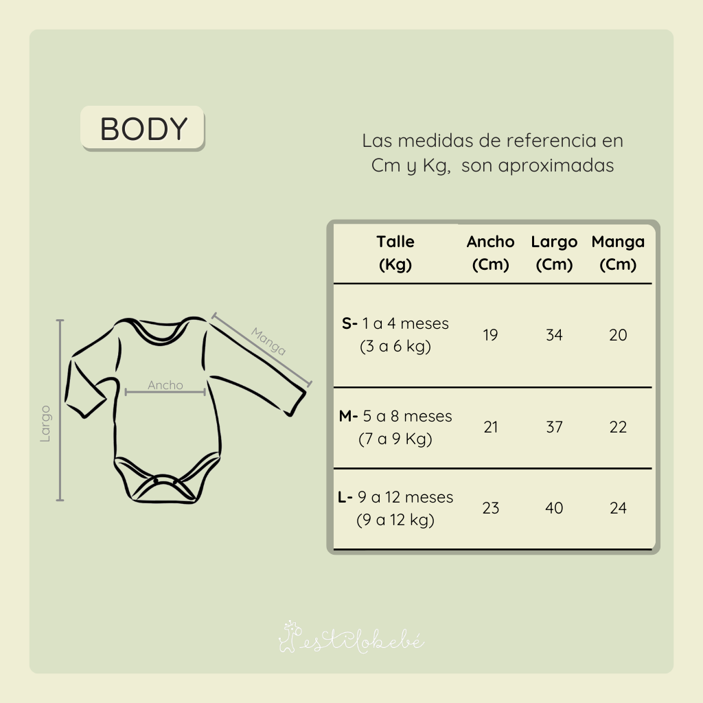 Nuestras medidas son aproximadas y orientativas. Sabemos que cada bebé es único y crece a su propio ritmo, por eso recomendamos elegir el talle según el peso y las medidas actuales del bebé, más que por la edad.