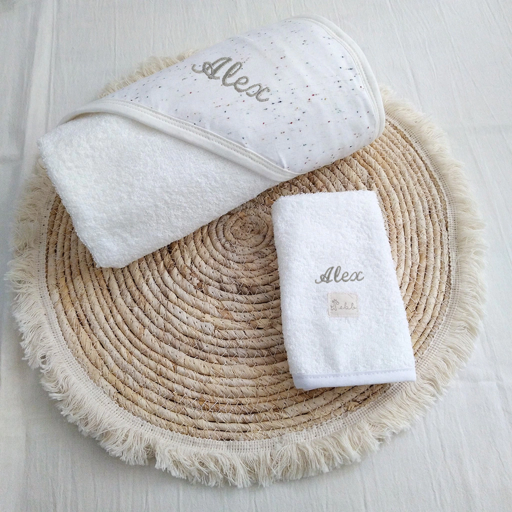 • Toalla doble felpa de algodón PREMIUM con capucha estampada Butoné multicolor PERSONALIZADA y ribeteada en jersey de color Crudo.